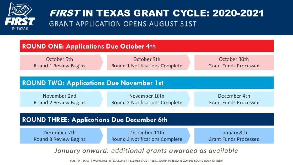 FIRST IN TEXASTEAM GRANT APPLICATIONFOR THE 2020-2021 SEASON WILL OPEN ONAUGUST 31, 2020The new team grant application will be available at www.firstintexas.org/grants. Teams only need to apply once to be considered for any FIRST in Texas team grants for which they are eligible. The following grants are available so far for the upcoming season: Texas Workforce Commission